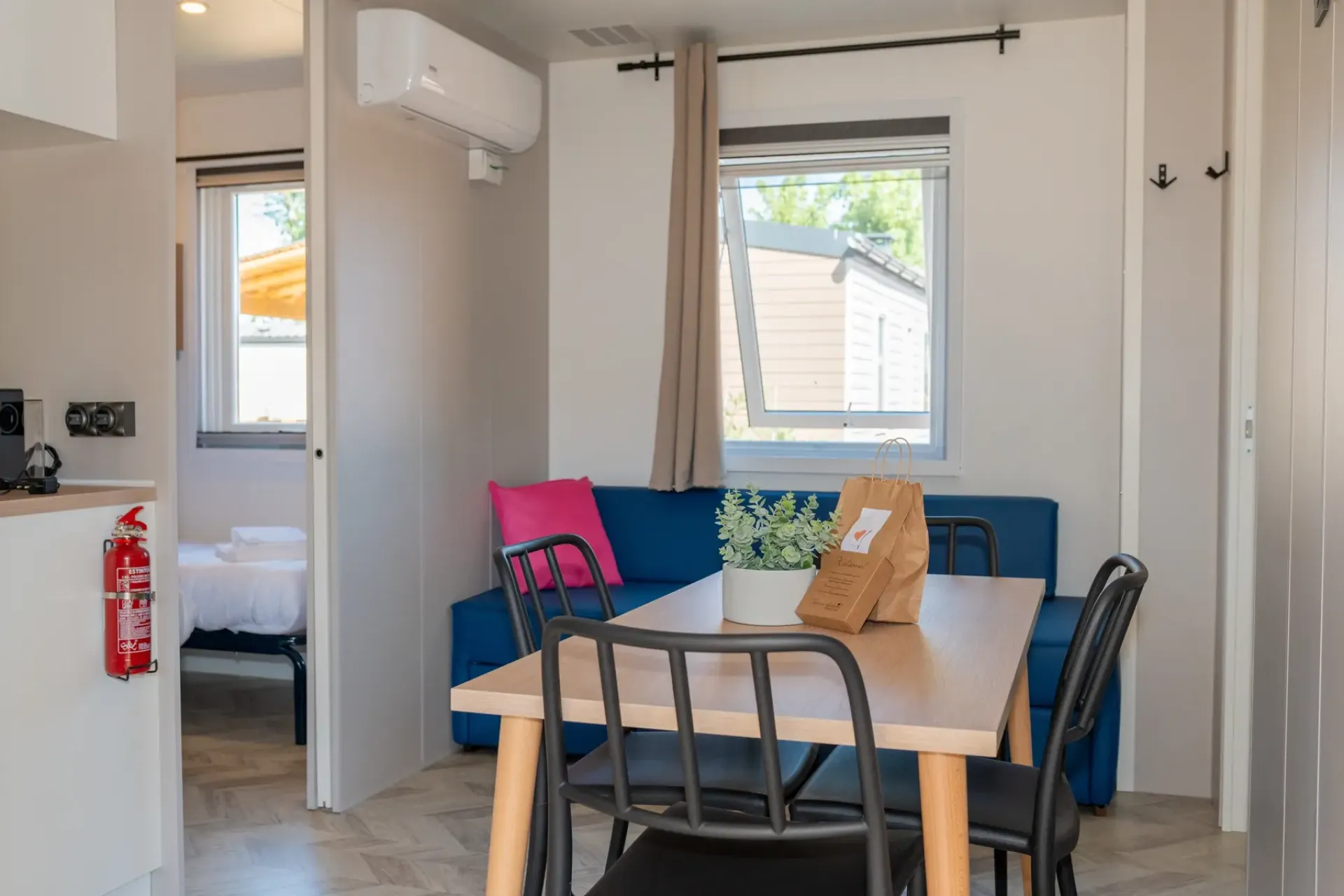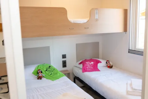 La Next XL Mercure è una delle nostre migliori sistemazioni per una vacanza in coppia o con tutta la famiglia. Questo accogliente alloggio è dotato di una camera da letto matrimoniale e una con 2 letti singoli e un letto ribaltabile, soggiorno con cucina ampiamente attrezzata, bagno completo e veranda. Animali non ammessi.